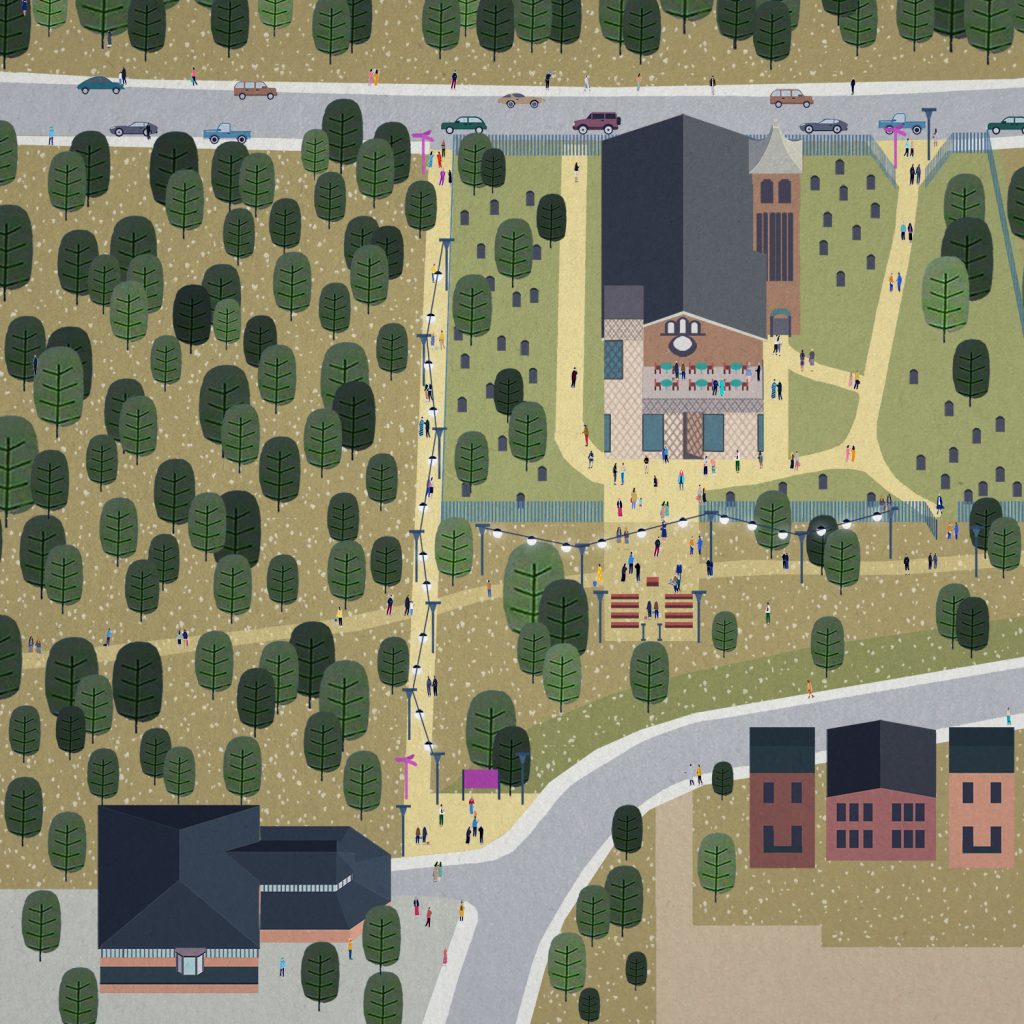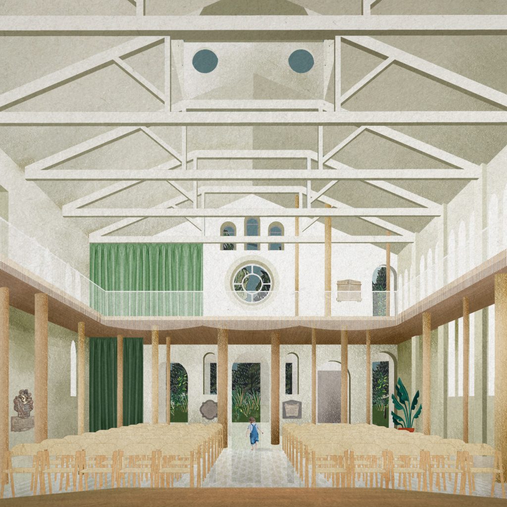The proposal also includes the renovation of the interior of the original church, primarily through the creation of a new gallery in the nave designed to evoke a cluster of trees, and a landscape strategy was also developed to connect the church up to existing walking & jogging routes, forest trails and nearby streets & community facilities.